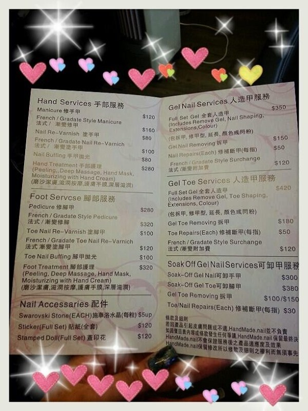 | 服務: | 修手/修腳/gel手/gel腳/soak off gel手/soak off gek腳/hand treatment/foot treatment |